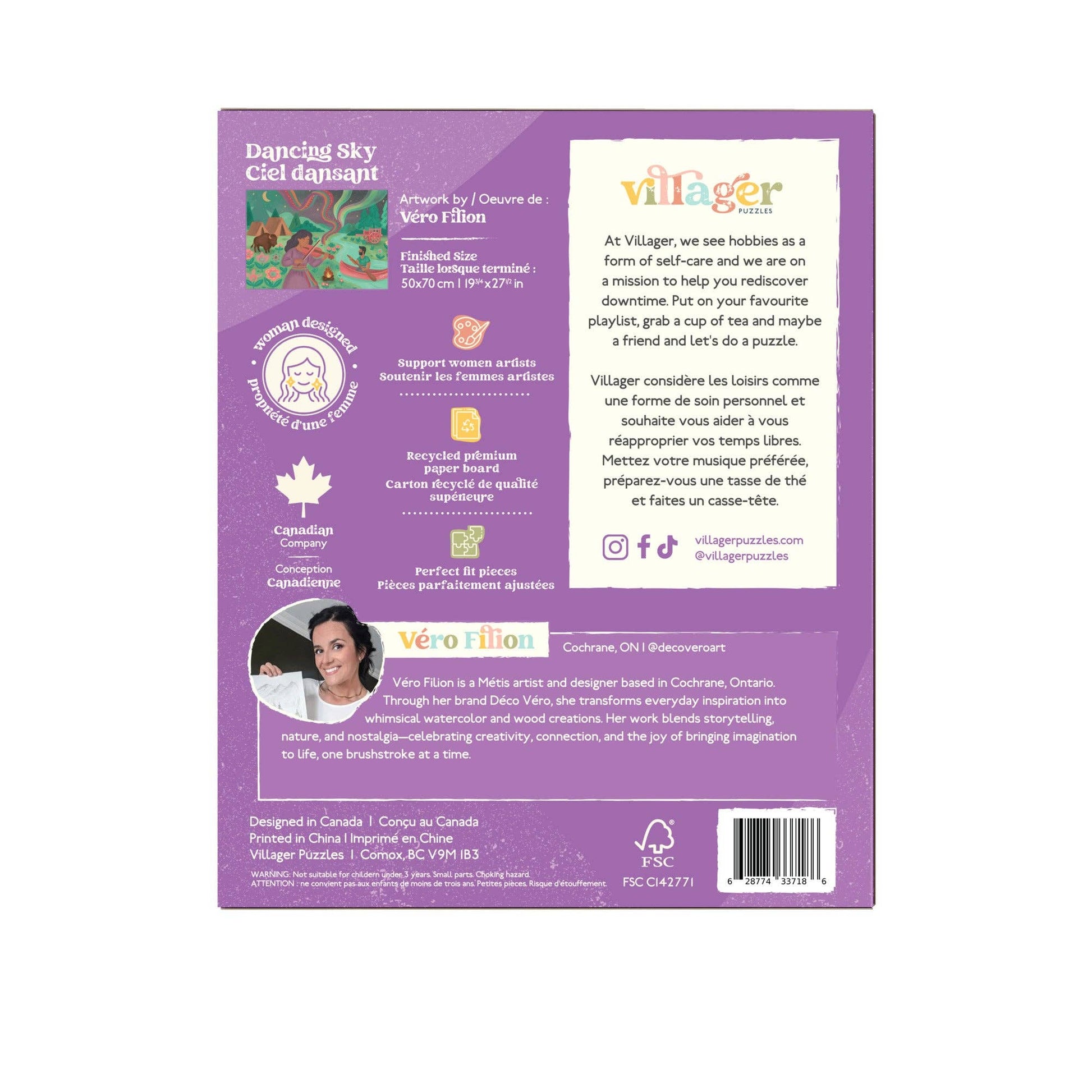 Inspired by Métis culture, this richly detailed scene was created by artist Cochrane, Ontario, Véro Filion, for the 2026 Villager Puzzles Call for Art. A fiddler plays near a riverside settlement as a paddler drifts by, alongside a bison, a Red River cart, and florals inspired by Métis beadwork, each symbolizing belonging and connection to the land. As the music rises, flowing Métis sashes become the northern lights, carrying culture between earth and spirit, past and present.