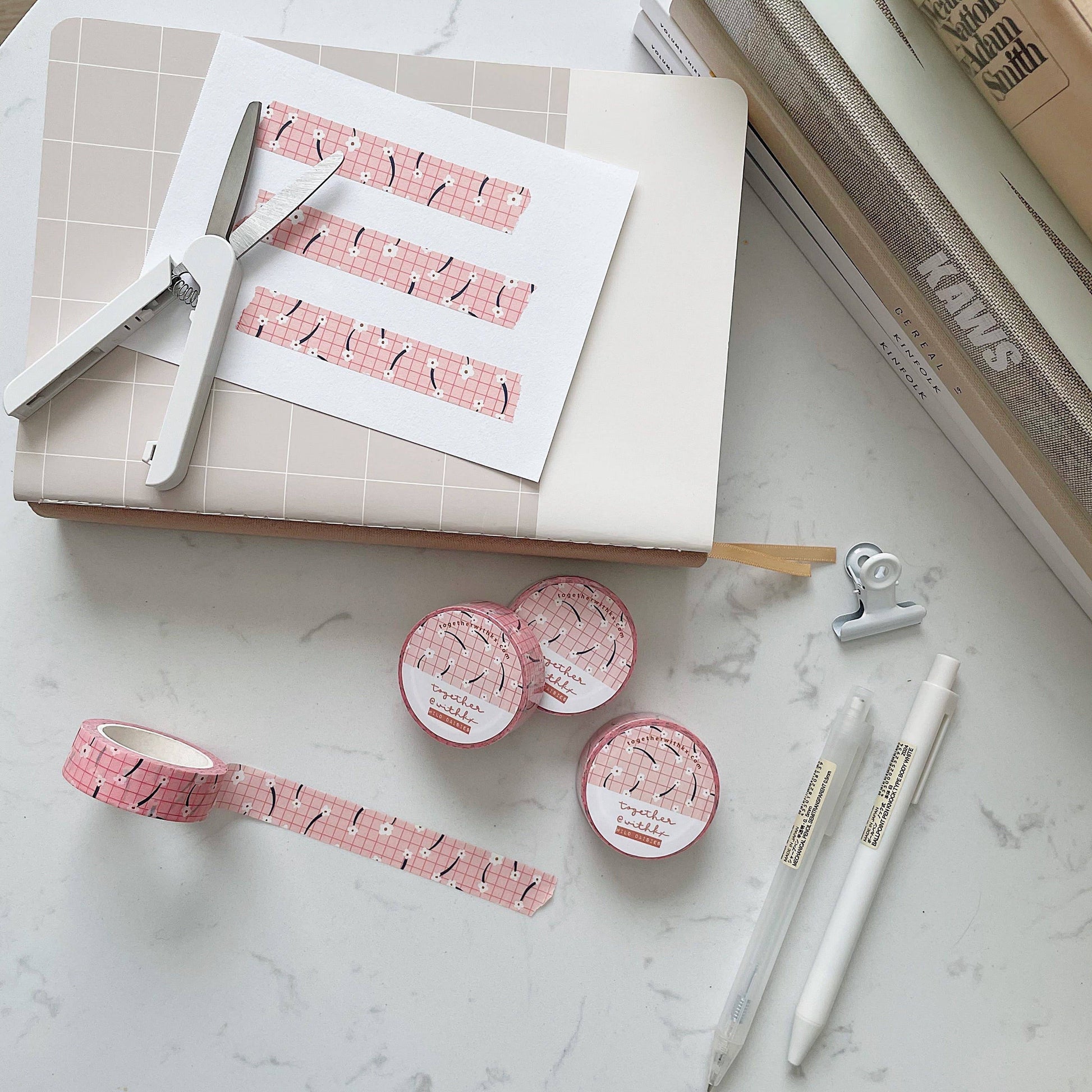 Say hello to sunshine in tape form. This charming roll of Flower Power washi features playful white blossoms dancing across a sweet pink grid—a retro-inspired delight perfect for spring and summer days. Designed with love in Edmonton, it’s ready to bloom across your journal pages, planner spreads, snail mail, and scrapbook keepsakes.